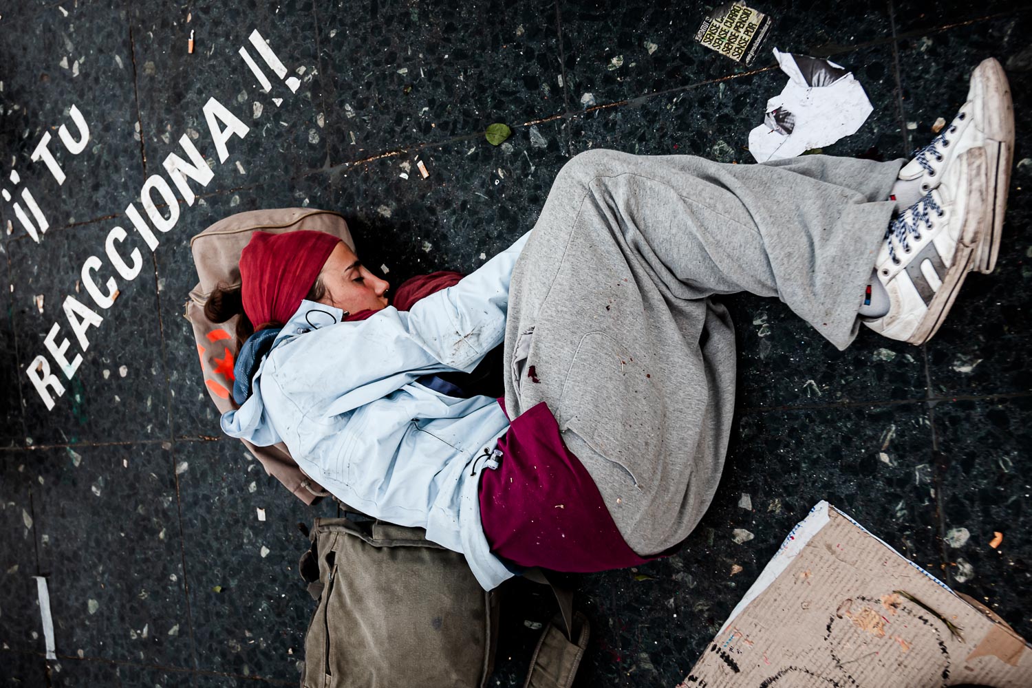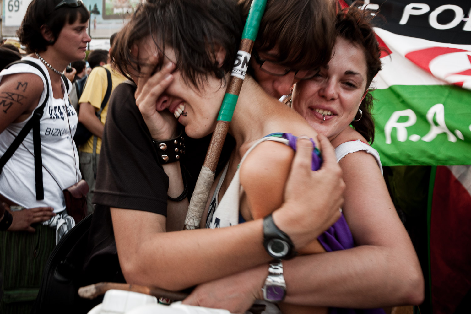 El 15M era emoción. Meses intensos de convivencia y utopía dieron para tejer complicidades. Del malestar nacieron amistades, amores y también conflictos: la infinitud de visiones, edades, experiencias políticas e ideologías, más allá de la indignación común, generaban chispazos que la comisión de convivencia intentaba apaciguar. Esta fotografía, tomada el último día de una marcha quijotesca que partió hacia Madrid desde Santiago, Cádiz, Bilbao, Murcia y Barcelona, resume los cuidados, la alegría y el agotamiento de aquellos días.