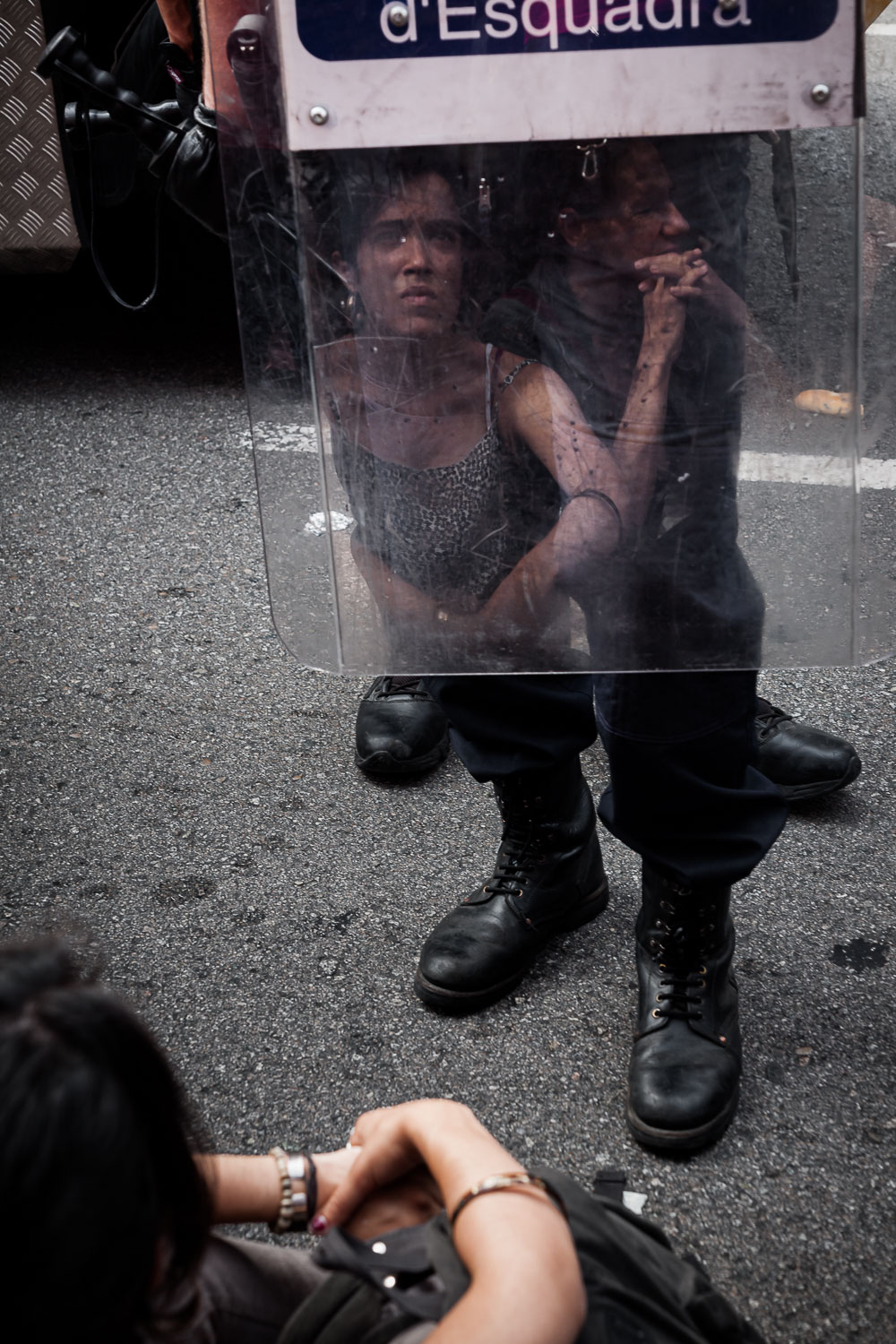 Negar es una manera indirecta de afirmar: en el 15M no había partidos, sindicatos, banderas ni portavoces. Algo que sí se aceptaba era la desobediencia civil. Y casi se imponía la no-violencia, para algunos una brújula moral y para otros una estrategia política. En 2017, en la misma calle donde tomé este retrato, las multitudes coreaban somos gente de paz tras los abusos policiales del 1 de octubre. En 2019, tras la sentencia del procés, volaban piedras y pelotas de goma.