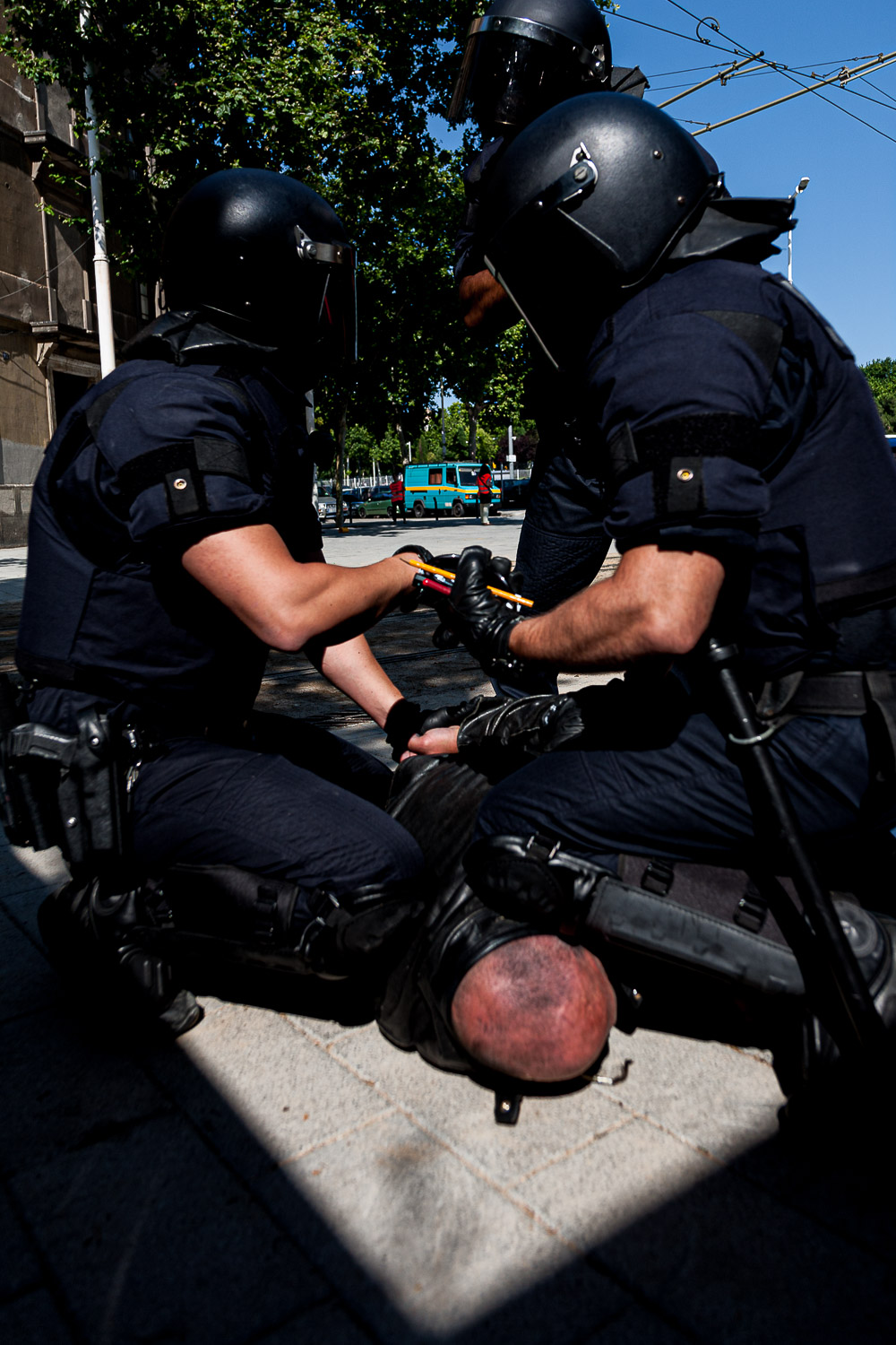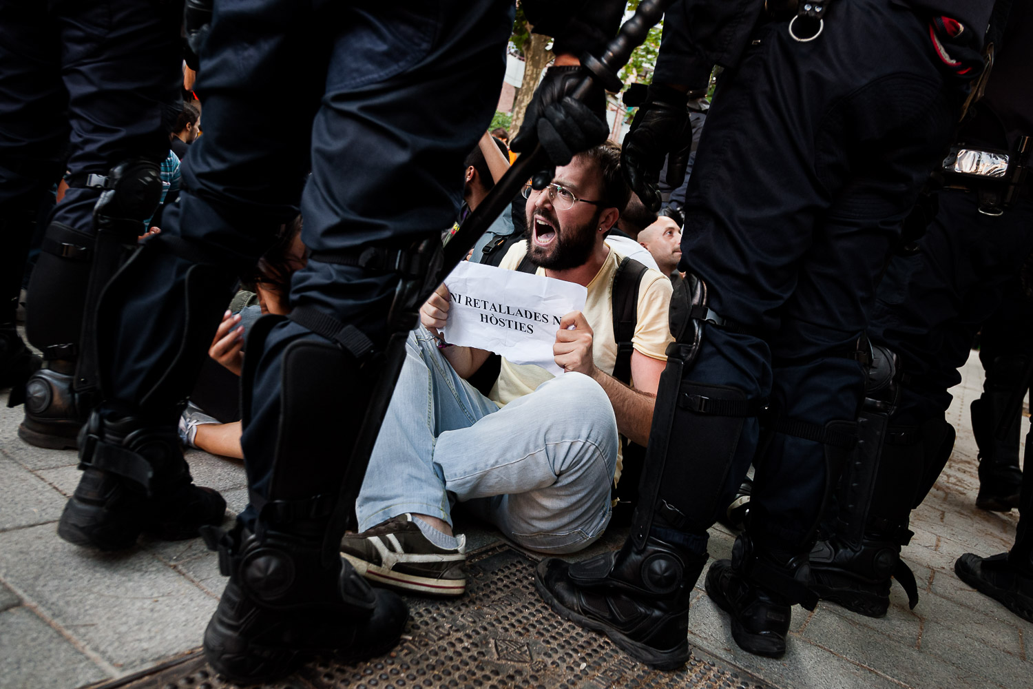 En el pedazo de papel rodeado de botas y porras se lee: “ni recortes ni hostias”. Pero hubo recortes y hubo hostias. La resistencia pacífica siempre me ha fascinado. No sé si podría ejercerla sin huir o contraatacar. El fotoperiodismo puede ser eso, una forma de denuncia, de defensa, de contraataque.