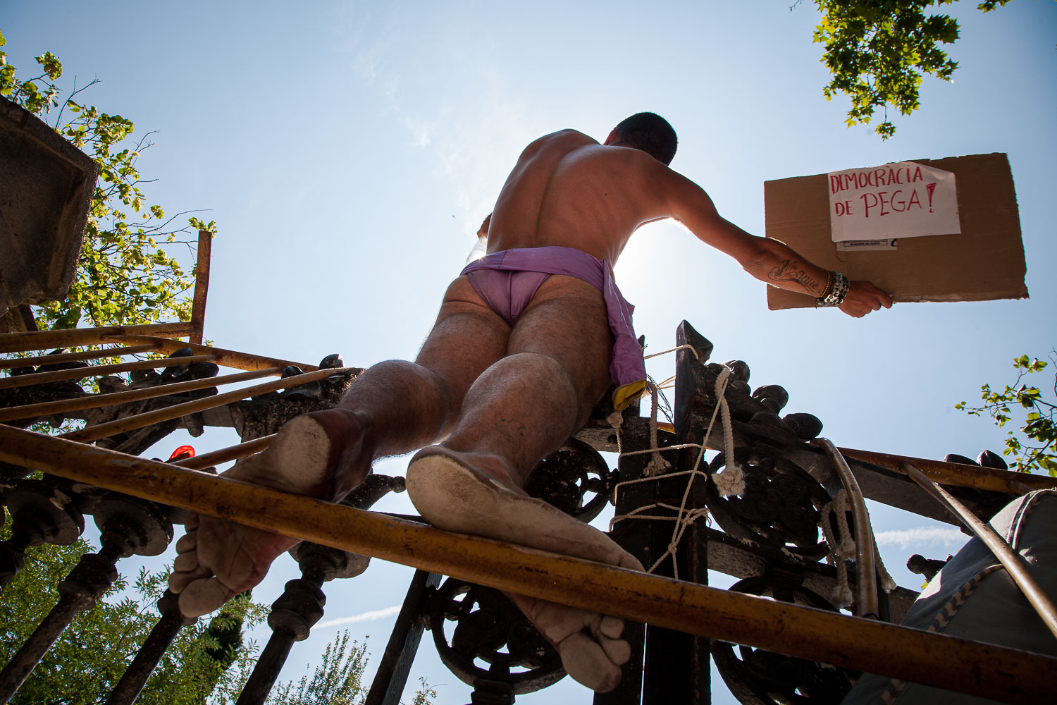 ¿Cuál sería el lema de la manifestación? ¿Paremos los recortes o Paremos el Parlament? Siempre me he preguntado si aquella discusión, otra más, tuvo consecuencias para todas las personas que fueron acusadas de delitos contra las instituciones del estado. Al final, el lema fue un híbrido: Paremos el Parlament: no dejaremos que aprueben los recortes. Sin sindicatos ni partidos políticos que lideraran ni ampararan las protestas, un hombre semidesnudo sosteniendo una pancarta de cartón simboliza, para mí, la fragilidad del movimiento, su inocencia y su voluntad adanista de empezar de cero, sin ropas viejas.