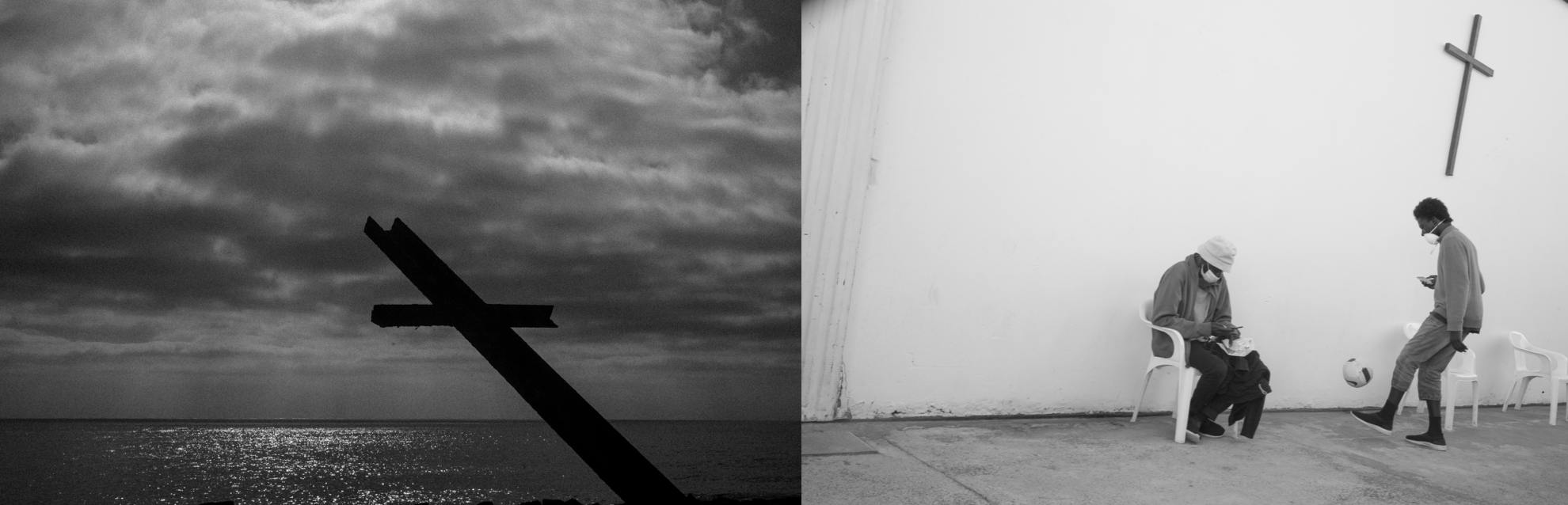 En el CEAR de Fuerteventura, las imágenes e iconografías cristianas decoran las paredes blancas del centro. La cruz, adentro del centro, pasa más o menos inadvertida mientras uno de los internos hace toques con la pelota. La cruz se sitúa aquí también como símbolo de la esperanza. Pero esta, a veces, decae y se ahoga en el mar.