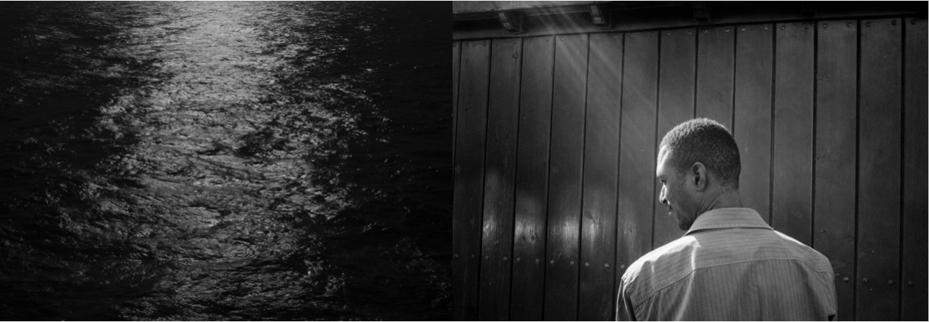 Una fotografía por la esperanza. El mar – denominador común en la serie del autor –, contrasta ahora con el rayo de luz que impacta en el perfil de la fotografía de la derecha. “Me explicó que venía de Guinea y que quería ser carpintero”. La luz también se refleja en la pared de madera de enfrente, simbolizando, ya no la esperanza, sino la materialización de esta.
