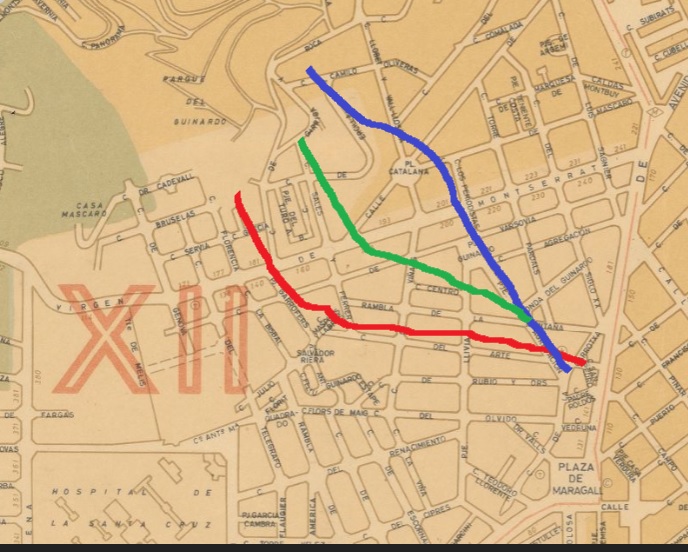 Quizá convenga recapitular sobre la dirección emprendida por esta santísima trinidad. El primer ramo del torrent de la Guineu, desde el parque, afrontaba su ruta paralelo al carrer de l’Art, y para entender cómo debía ser su ritmo basta alucinar con la pendiente asfaltada. El segundo, desde Sales i Ferré, aguardaba el instante de fusionarse con el tercero en rambla de la Muntanya con el extinto passatge de l’Agregació. La ronda del Guinardó, omnipresente como arteria con suficientes arrestos como partir el barrio en dos, no es obstáculo para reconocer el sitio del anudamiento, antesala de la alianza definitiva de la familia en la plaça de Carles Cardó, marcada por sus irregularidades orográficas, desvanecidas, como la masía de Can Vintró, a buen seguro agradecida por tanta profusión acuífera yéndose hacia el mar, su inevitable morir.