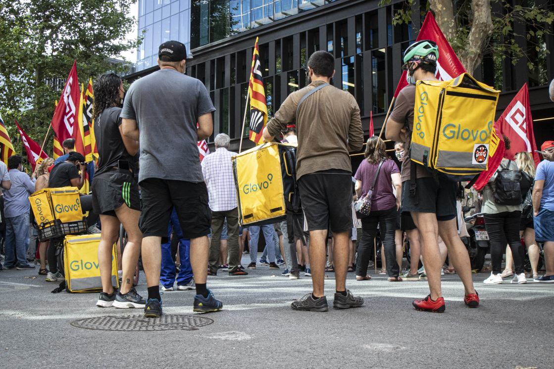 El sindicat CCOO ha reunit a un centenar de persones a les portes de l’oficina central de Glovo per reclamar la millora de les condicions laborals dels repartidors i repartidores de la plataforma. Dins la campanya “Prou d’excuses, laboralització JA!”, el sindicat visibilitzava avui el conflicte i la precarietat del model d’economia de la plataforma, però també assenyalava que molts treballadors no saben encara que serà d’ells a partir del 12 d’agost.