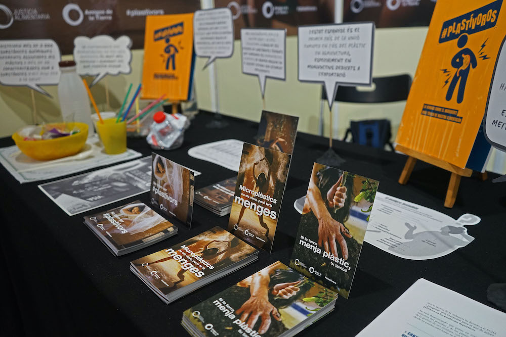 “Comes plástico. Te envenenas a diario”, “Si la tierra come plástico, tú también”, ”Cuando bebes agua te llenas de microplásticos”, “Comes petróleo”, son frases que llaman la atención a los visitantes de la Feria de Biocultura celebrada recientemente en Barcelona. Impactan tanto como las imágenes que las contienen, presentadas en el stand de Justicia Alimentaria, junto con el informe “Plastívoros”, publicado por dicha organización y Amigos de la Tierra. En dicho informe se expone la alarmante contaminación por microplásticos en el medio terrestre y su grave impacto en nuestra alimentación, salud y ecosistemas.  Las prácticas del lobby plástico y las propuestas para revertir la problemática actual también se plasman en dicho documento.