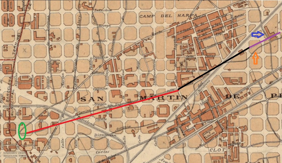 Este, si atendemos a un planisferio de 1891, sería una bifurcación de la carretera de Horta en dirección a Sant Martí de Provençals. Ambas sendas partirían en la actual esquina de Nàpols con Diputació. La nuestra mutaría de nombre a lo largo de su avance, primero como calle dels Enamorats, una auténtica reliquia en desafío al Eixample, cruzándolo sin vergüenza alguna, y después como vía Molinaria o Sedeta, engullida por el carrer de València justo cuando el romanticismo desaparece del mapa. Aún hoy en día Enamorats, de la que prometo más estudios por sus particularidades, está bien regada, como así atestiguan sus huertos, hermosos entre tanto cemento, héroes con guiños a la posibilidad de explotarlos sin miedo para mejorar nuestras vidas desde criterios sostenibles.