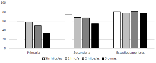 El desarrollo de políticas de familia es necesario para poder expandir la protección social en términos de género. Sin embargo, en contraste con los viejos esquemas de la seguridad social, principalmente dirigidos a la clase trabajadora, los datos muestran que las políticas de familia pueden excluir sectores de las clases trabajadoras. Por una parte, los precios de las guarderías y la escasez de plazas públicas causan que el acceso esté segregado por renta. Por otra parte, muchas personas en empleos precarios o de baja cualificación tienen problemas para beneficiarse de los permisos parentales debido a su situación vulnerable en el puesto de trabajo. Esto hace que sea necesario evaluar y reformular el diseño de estas políticas, así como alterar la regulación del mercado laboral, para poder beneficiar también a las familias trabajadoras y precarias. El siguiente gráfico muestra el resultado de este problema. Mientras que el número de hijos no impacta la participación laboral de las madres de mayor nivel educativo (y por lo tanto con mejores trabajos), ambas responsabilidades se convierten en incompatibles para las demás.