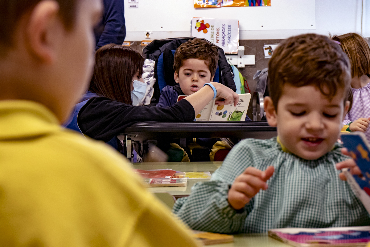 La primera impresión cuando uno ve a Aleix es que quizás tenían razón aquellos profesionales del EAP que en el pasado período de preinscripción dictaminaron que estaría mejor haciendo P3 en un centro especializado. Pero ésta es una primera impresión de adulto con mirada de adulto. La que tuvieron sus compañeros y compañeras de tres años cuando le vieron por primera vez en el aula fue otra: para ellos, Aleix es sólo un compañero al que hay que cuidar especialmente. “Debemos aprender mucho de los niños, ellos lo han vivido con toda la normalidad desde el primer día”, explica Maria Ribas, la tutora de la clase de los caracoles, uno de los grupos de P3 de este año en el Col·legi Claret de Barcelona.