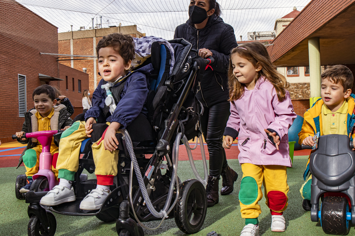 Además de maestra, Maria tiene un máster en neuroeducación por la UB (fruto del que ha hecho formaciones con el resto de compañeras de infantil y del que también surgió la idea de incorporar un aula sensorial en el centro). Y canta con los niños mientras toca el acordeón. Cuando lo hace, a Aleix le cambia la cara. Los niños y niñas le rodean, pero lo hacen ordenadamente. “Al principio todos querían estar con Aleix y se abalanzaban –explica Anabel, del CEEPSIR–, por eso tuvimos que trabajar esta relación, ahora todos saben que sólo pueden ir de dos en dos y que pueden abrazarle y tocar todo menos los cables”. Aleix desayuna cada día con el resto de compañeros. Pero él lo hace por el botón gástrico. También, de vez en cuando, la enfermera debe aspirarle el tubo, para dejarlo limpio, y esto ocurre con más frecuencia si tiene mocos.
