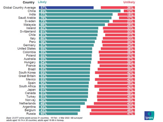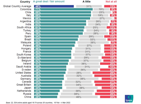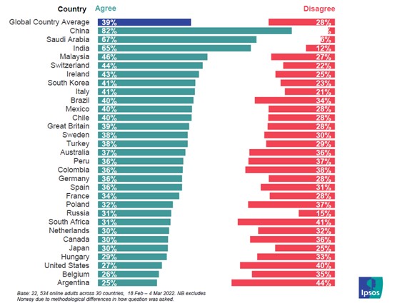Destacan China (82%), Arabia Saudita (67%) e India (65%), que son los países que creen, en mayor medida, que sus países cuentan con planes definidos y en marcha para abordar el cambio climático. Bélgica y Argentina, por el contrario, ocupan los dos últimos puestos de este ranking.