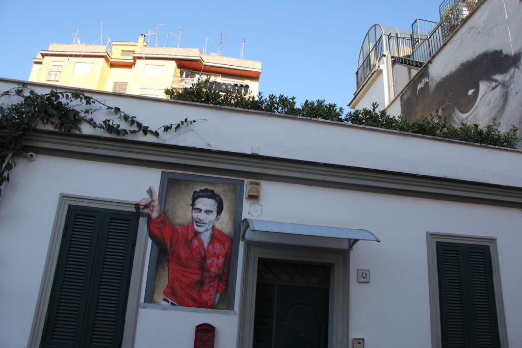 Al otro extremo del barrio, con ecos de Anna Magnani en Roma Città Aperta, cruzo un puente de hierro junto a las vías del tren e irrumpo en la via Fanfulla da Lodi, clímax del Street Art dedicado a Pier Paolo Pasolini. La calle fue uno de los epicentros del rodaje de Accattone. Recomiendo verla y comparar el before and after desde múltiples ángulos. El poeta, que según Bernardo Bertolucci reinventó el séptimo arte, quiere escapar sonriente de una ventana. Nos saluda contento, con ojo inquisidor en un muro adyacente, armonizándose esa pupila de aviso con la alegría roja de abajo.