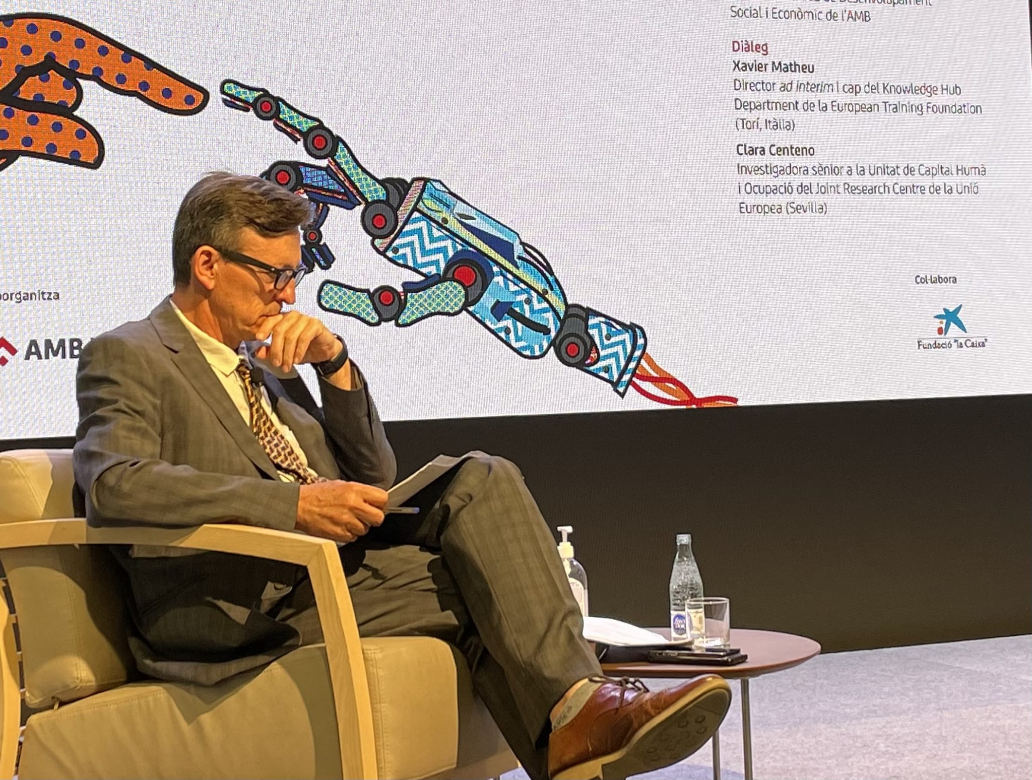 Para debatir sobre el futuro del trabajo, en las anteriores jornadas se tuvo el punto de vista de los agentes sociales, de instituciones y academia y el último diálogo, con una perspectiva europea, Xavier Mateu, director ad interim y jefe del Knowledge Hub del Departamento de la European Training Foundation explicó su gestión en el ámbito laboral. Aunque afirma que todavía se desconoce cómo se articulará el futuro del trabajo, defendió la importancia de establecer “sistemas flexibles de formación”, ya que lo que es seguro es que “tendremos que formarnos continuamente para poder ser competitivos en el mercado laboral”. Mateu manifestó que es necesario explotar al máximo “el sentido común, el pensamiento crítico, la empatía y la creatividad” ya que es lo que nos diferencia de los robots. En la misma línea, Clara Centeno, investigadora senior en la Unidad de Captital Humano y Empleo del Joint Reserach Centro de la Unión Europea, también recalcó que es necesario tener un “aprendizaje permanente”, mediante una oferta formativa ágil. Manifestó que las competencias digitales tienen cada vez más relevancia. De hecho, en 2014 un 85% de los puestos de trabajo ya requería un nivel básico digital.