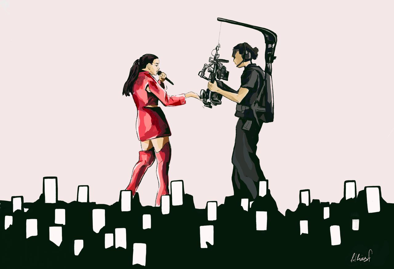 En aquest cas, tots els artefactes tecnològics de què disposa i dels quals Rosalía en fa ús, es converteixen no només en una eina, sinó en un segell d'identitat. Crea una quarta paret, on hi ha moments en què en lloc de cantar mirant cap al públic, canta cap a la steadicam, i alhora, aquesta quarta paret, és la que li permet que tot el Sant Jordi vegi els seus ulls mirant directament cap a ells. Si bé es podria pensar que és una cosa arriscada i que tenir un senyor gravant, càmeres en llocs inhòspits i un estil social media podrien donar sensació de fredor o llunyania, al públic sembla importar-li més aviat poc. Més enllà d'això, el públic sembla estar gaudint i connectat amb l'artista amb la qual probablement comparteixin cert imaginari, entenguin el que està fent i hi donin suport. El concert potser és un metaconcert, on passen moltes coses alhora i es veuen a diferents capes, on les pantalles no es limiten a deixar veure, sinó que busquen crear una pel·lícula, un videoclip permanent, un muntatge cuidat al detall. Les càmeres, els selfies, el TikTok, l'estètica orquestrada, els ballarins que de vegades apareixen d'esquena en persona però es veuen de front pel steadicam omnipresent, els qui decideixen quina càmera punxar a cada moment, fins i tot el meme viral, "sassy Rosalía", on es recopila el gest xulesc de l'artista en cada concert abans de cantar "Bizcochito".