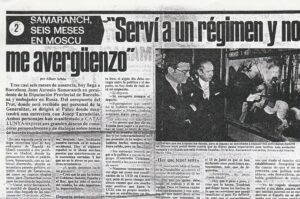 Durante la transición, Samaranch trató de reinventarse como líder demócrata de toda la vida, con bastante menos éxito del que tuvieron otros, puesto que su propuesta política (Concordia Catalana) fracasó. Por eso pidió al Gobierno de UCD la embajada de Moscú, que entonces no existía, un movimiento que finalmente le catapultaría a la presidencia del COI, del cual formaba parte desde 1966. Antes trató de borrar todo rastro de su pasado falangista. En el archivo de La Vanguardia los más veteranos recordarían durante años como la carpeta de fotos de Samaranch fue vaciada de la noche al día. Lo mismo pasó en otros rotativos. Pero camuflar un pasado tan fecundo era misión imposible, y con el tiempo reaparecerían fotos suyas haciendo el saludo romano o situado en algún acto oficial al lado del generalísimo y otros jerarcas franquistas.