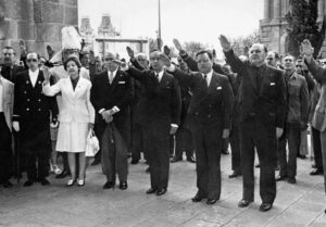 Alguna de estas fotos las usaron los periodistas Andrew Jennings y Vyv Simson en el libro The Lords of the Rings, publicado en 1992, con motivo de los Juegos de Barcelona. Los autores eran dos periodistas británicos de larga trayectoria, trabajaban por la televisión británica Granada y venían de recibir premios y reconocimientos por su investigación sobre la corrupción en Scotland Yard. En realidad, antes del libro hubo un documental de televisión, donde se vé como un día de primavera de 1992 Jennings asalta a Samaranch a las puertas de la sede suiza del COI para facilitarle dos fotos suyas de los años del brazo alzado y le sugiere que formen parte de la colección permanente del Museo Olímpico de Lausana, entonces en construcción. Samaranch se las mira un instante, no dice nada, y las devuelve a su interlocutor.