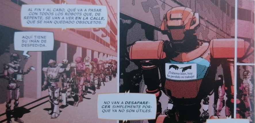En cualquier caso, los autores del cómic también se aprovechan de dicha evolución e incluyen en el cómic una escena en la que los robots policías acuden a un domicilio por la alerta de los vecinos y descubren a una familia masacrada por su robot, al que le ha podido la ira. Los policías no lo detienen… «No hemos visto ningún indicio de criminalidad», afirman por radio mientras muestran indicios de complicidad con el robot asesino similar a las que vemos cuando los policías saludan a fascistas en las manifestaciones o cuando acaban de asesinar a una persona de color que supuestamente iba armada (a pesar de que resulte que no lo estaba). En Estados Unidos se conoce como el «muro azul del silencio», en la que los policías no se acusan entre sí ante una mala praxis.