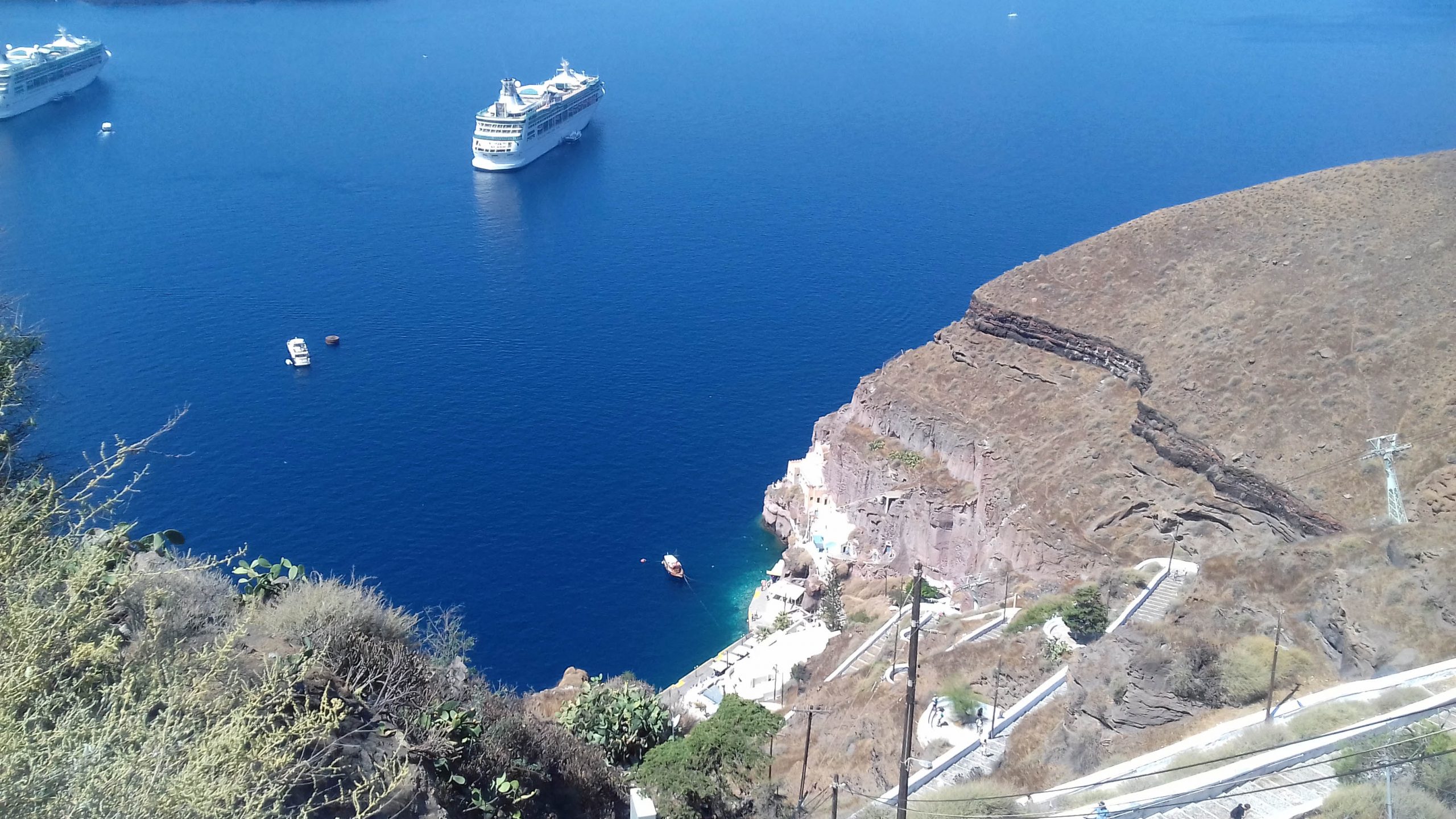 La resta del creuer va transcórrer com estava previst, sense sorpreses per nosaltres. Les destinacions a les illes gregues consistien en enclavaments d’altíssima intensitat turística en els quals es concentraven diversos creuers per una població de pocs milers de persones. La sensació era de tsunami turístic, però no hi havia gent local a la vista que es pogués queixar, només queden els comerciants i restauradors, la resta no se sap on son si és que queda algú fora del sector turístic a llocs com Santorini. Aquesta illa volcànica va ser una de les inaccessibles per la cadira de rodes. El port no admetia el creuer i, un cop a terra, calia pujar unes escalinates per arribar a una mena de telecabina que portava dalt de l’illa, on hi ha els poblets.