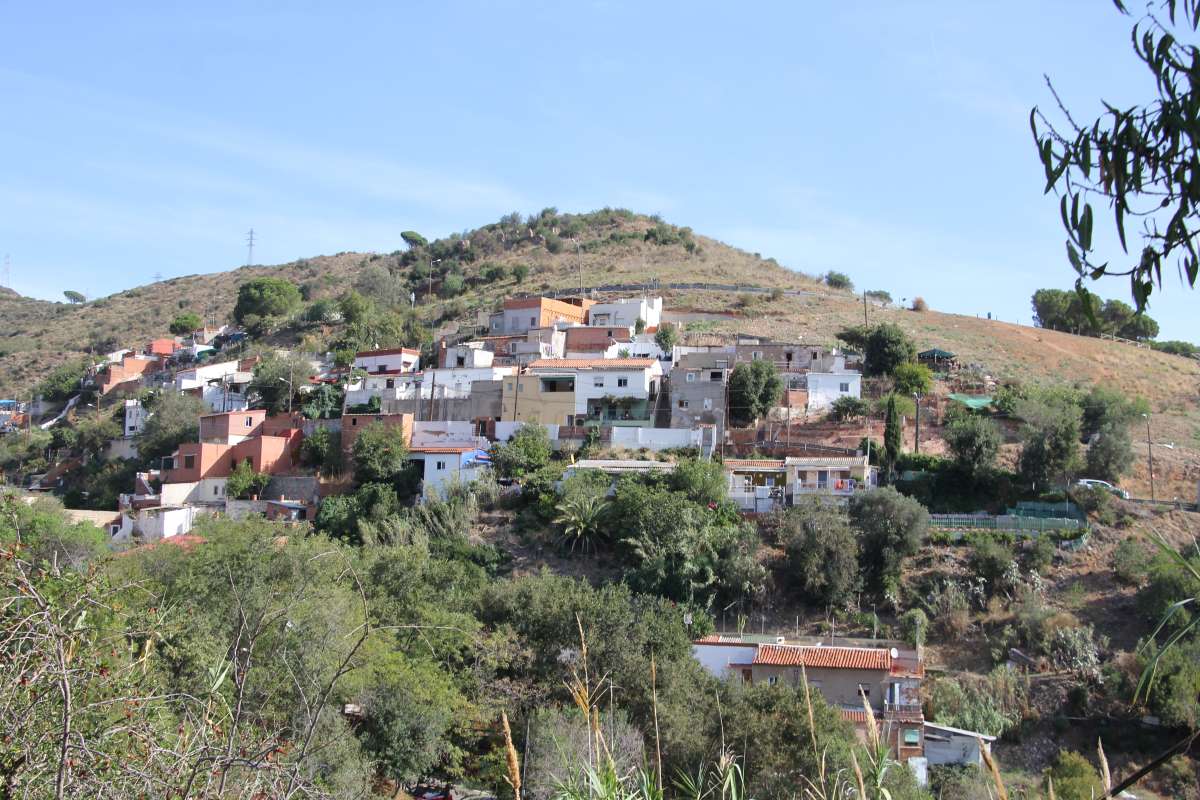 Una flecha a su derecha me conduce a un descampado urbanizado, con fincas de planta y un batiburrillo de construcciones medio anárquicas. Impresiona la vista del fondo, un monte con una senda de cenefa casi hasta su cima, surcada por villas como si salieran de un cuadro de Paul Cézanne.