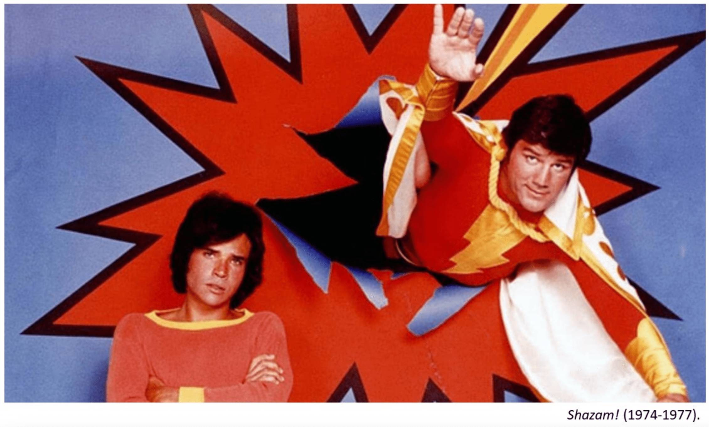 Viendo que no había forma de recuperar el nombre del personaje, la editorial decidió que el superhéroe se bautizara también con el nombre de Shazam, que es el nombre que se le puso en la serie de televisión que se emitiría en los años setenta durante tres temporadas con dos actores para distinguir al adolescente del superhéroe adulto: Shazam! (1974-1977). El personaje lo veríamos también en los dos episodios de un curioso especial: Legends of the Superheroes (1979), donde se recuperaban, entre otros actores, a Adam West y Burt Ward, una década después de su mítica interpretación de Batman y Robin en la serie de televisión de los sesenta. La experiencia televisiva funcionó como una forma de integrar Shazam en el universo de DC (recordemos que, inicialmente, eran personajes de editoriales competidoras en el mercado).