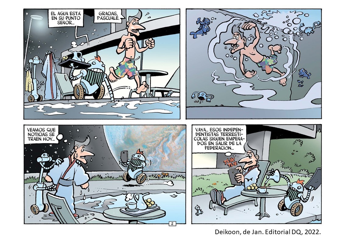 Keegan, ministra de Educación, soltaba esa contundente frase en televisión llevando en su muñeca un reloj de una popular marca de lujo, valorado en más de 11.000€, lo que le supuso un aluvión de críticas por aparentar frivolidad y falta de sensibilidad en un momento tan delicado para la sociedad. ¿Pero, a quién le importa realmente esa sociedad? Jan, seguramente, formularía ahora esa pregunta de forma un poco diferente y hubiera dicho: ¿Pero, a quién le importa realmente esos terrícolas? Ese es el poder de la ciencia ficción sociológica, en el que puedes plantear una sátira de la sociedad actual situando la trama en un futuro hipotético. Y ese es el camino que decidió escoger el autor hace poco más de un año, saliéndose de su zona de confort que había sido durante décadas la creación de su personaje más archiconocido: Súper López.