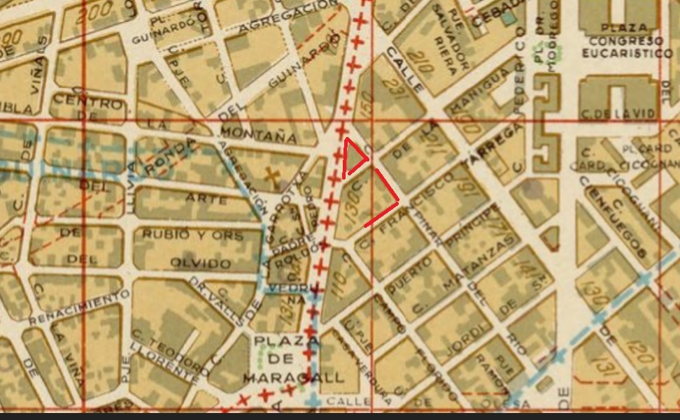 El hijo se llamaba como el padre, pero pese a ello la cronología disipa dudas en cuanto a la autoría de ciertos actos. Ferrer Dalmau había adquirido tierras en el inexistente 127 de Pinar del río, en la esquina con Francesc Tárrega. Más tarde averigüé el emplazamiento exacto de sus posesiones, justo en la continuación de la masía de la Gallinaire. La casa dels Indians figura en los pliegues como su domicilio, meollo de un pequeño imperio en la parte alta de la barriada, pues además de su vivienda en Pinar del Río controlaba dos más en la misma calle y otra parcela en la esquina de esta con Manigua, en realidad un triple cruce por la rabiosa proximidad de passeig de Maragall.