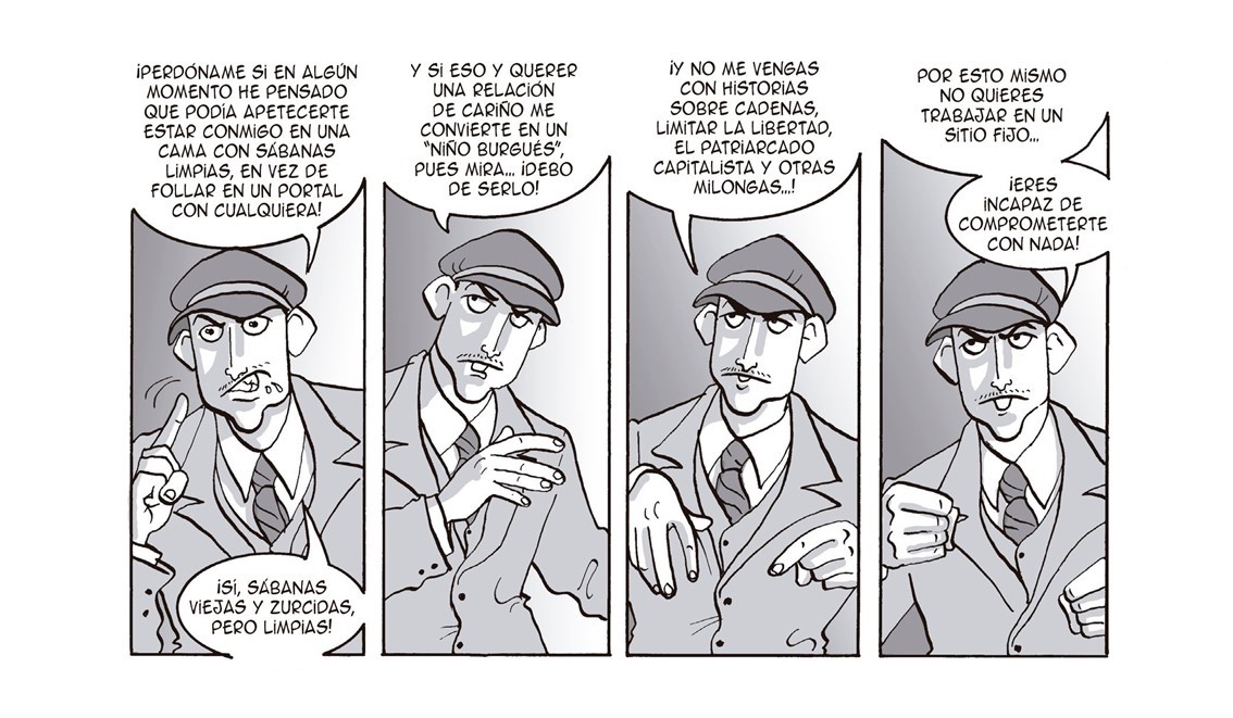 L’escenari que ens mostra Martín és un dels pilars de la investigació sociològica: fins a quin punt la interacció social influeix en el nostre comportament i condiciona les nostres decisions? fins a quin punt les estructures socials limiten les nostres llibertats? Una altra dada interessant és l’evolució en les creences i els valors amb el pas del temps, i un bon exemple és Manolín, suposadament d’esquerres. A les primeres pàgines de la novel·la gràfica, el cunyat anarcosindicalista recomana a Tomás que llenci el llibre de poemes de García Lorca, «Aquest que diuen que és marieta… Els invertits són presa d’un vici burgès!». El món al revés, aparentment, també passa una cosa semblant amb la policia que suposadament ens deu protegir, i no són, ni de bon tros, el que aparenten.