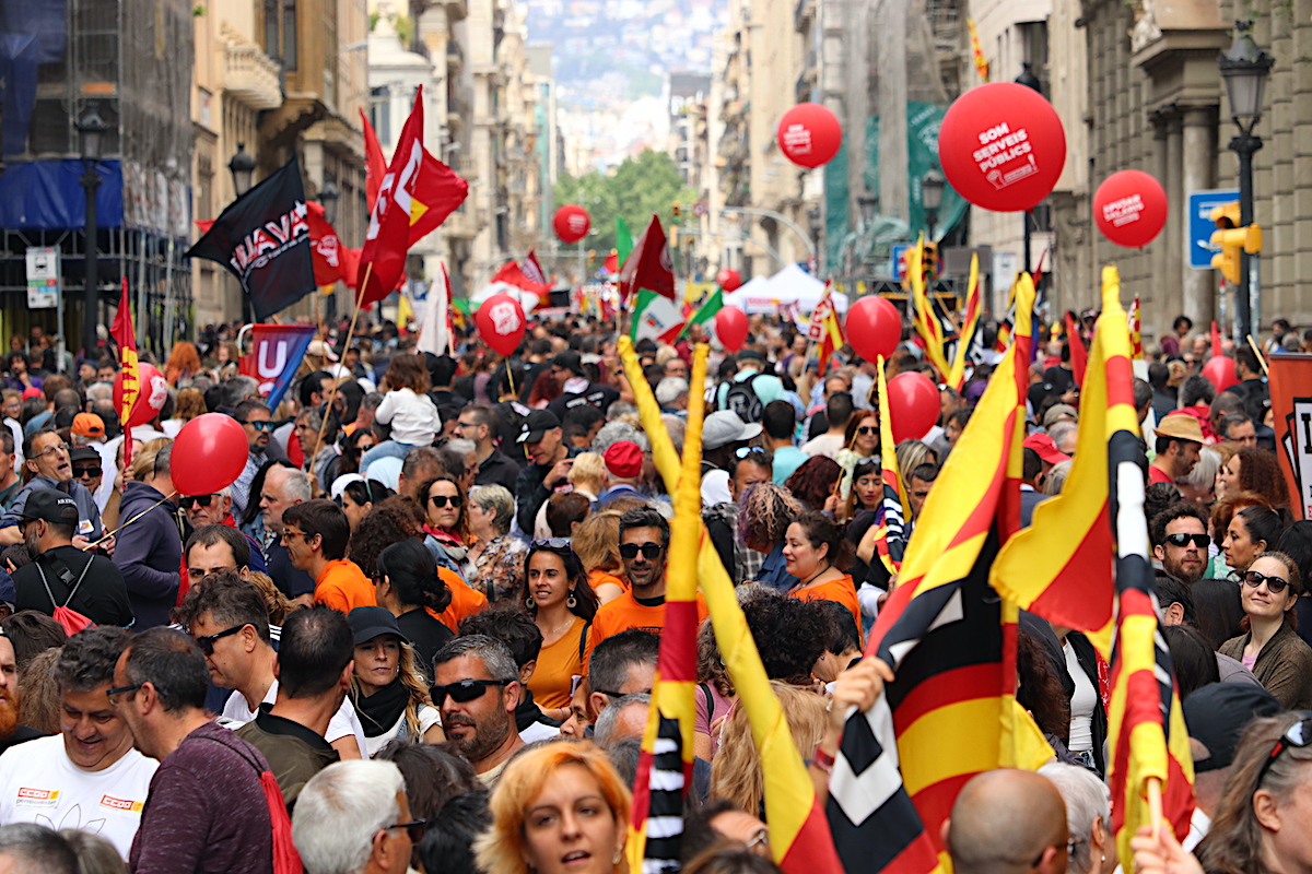 La Via Laietana ha vuelto a presenciar una manifestación en un primero de mayo que terminaba en la plaza de Correos y que según los organizadores ha congregado a 5.000 personas. Las movilizaciones, que este año tenían por lema “Subir salarios bajar precios, repartir beneficios”, también se han convocado en otras ciudades catalanas como Tarragona, Girona, Lleida, Terrassa, Tortosa o Igualada.