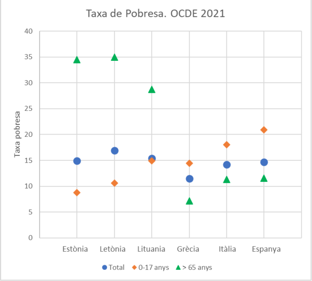 Com s’ha comentat, l’OCDE utilitza una metodologia per calcular la pobresa diferent de la Unió Europea, i les seves dades no estan tan actualitzades, però tenen un component visualment interessant que es pot observar a aquest enllaç. Dels països de l’OCDE, Txèquia (5,6%) i Finlàndia (5,7%) són els que tenen un percentatge més baix de població sota el llindar de la pobresa, mentre que Espanya (14,7%) ocupa el 13è lloc amb més pobresa. Al següent gràfic podem observar una comparativa de la taxa de pobresa de tres països bàltics i tres de mediterranis extretes de l’enllaç anterior. Com es pot veure, la distribució de la pobresa per edats és totalment contrària. Els majors de 65 anys mostren taxes de pobresa molt importants als països bàltics, mentre que en els menors de 18 anys la pobresa es redueix per sota la de la població general. En canvi, en els països mediterranis la situació és inversa, les taxes de pobresa de les persones majors de 65 anys són menors que les de la població general i les dels menors de 18 anys són en canvi majors.