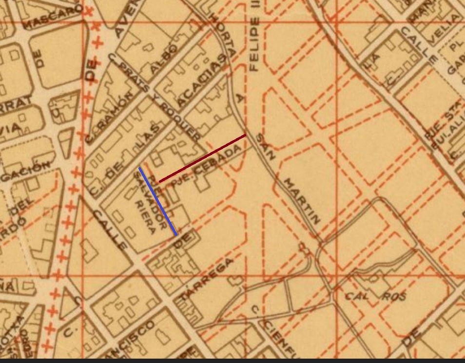 Los passatges de Salvador Riera y el de l’Ordi parecerían no existir. En un mapa de 1931 apenas están esbozados. El del fundador del barrio se insinúa sin siquiera bautizarse, mientras el segundo tiene un aspecto algo más cuajado, sin consolidar en la posguerra según un planisferio de 1943, donde se advierte su trazado ideal, truncado a mediados de los cincuenta con la aparición de Federico Mayo/Alexandre Galí, la bestia anómala de todo este entorno.