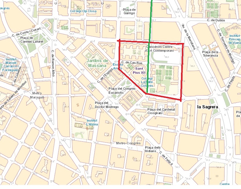 De este modo, existe un quinto elemento en las coordenadas del Congrés, marcado por la finca rural y la Riera d’Horta. En este espacio, el entramado horizontal no prevalece, pero se mantiene hasta cierto punto por la extensión de la calle de Pardo, si se quiere la prueba esencial para verificar cómo la obra de Soteras Mauri, Pineda Gualba y Marqués Maristany es una perversión en toda regla, porque une lo nuevo con lo viejo sin anomalías de ningún tipo.