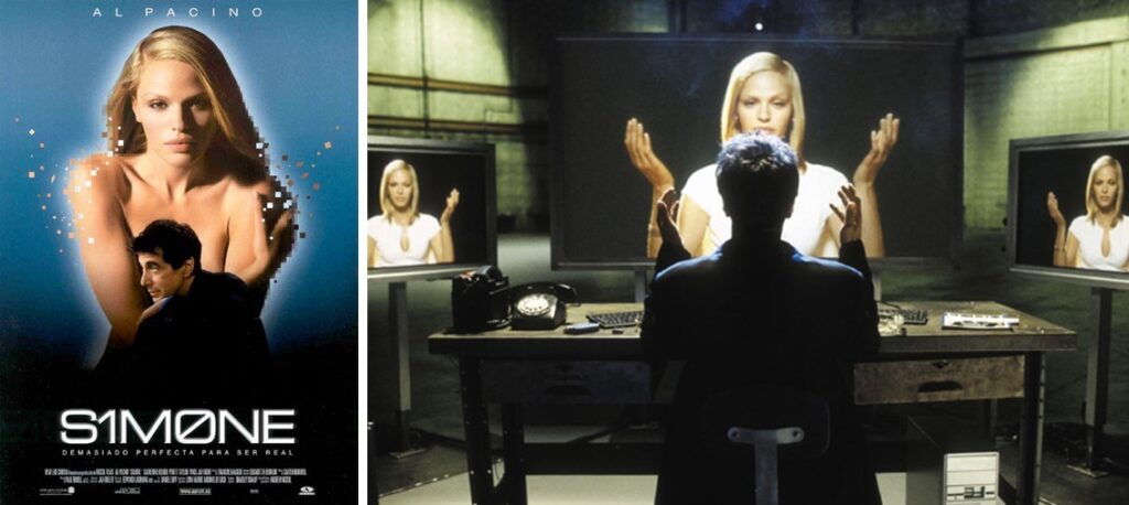 En Simone, cuando la productora de las películas del estudio cinematográfico descubre el fraude y la manipulación de su director con la virtual actriz falsa, su reacción es significativa: «¿Por qué hacer solo un personaje cuando puedes hacer todo el reparto?». Pues, no lo sé, Rick…