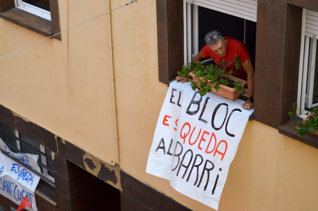 Un vecino apoya el bloque con una pancarta en la ventana. | Jordi Pascual Mollá