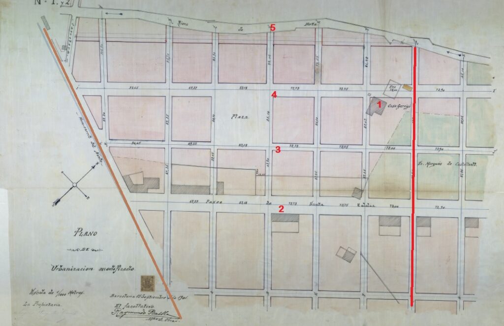 Mapa del proyecto de urbanización del futuro barrio de la Jota, 1901. 1- Can Garrigó 2.- Passeig de Fabra i Puig 3- Carrer de la Jota 4.- Carrer Escòcia 5- Riera d’Horta En Rojo, el límite entre los terrenos de María Ángeles Puig España y la Marquesa de Castellbell, en marrón la Meridiana.