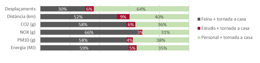 A pesar de que la movilidad laboral supone un 30,4% del total, contribuye en más de un 55% del total en el consumo de energía y emisiones contaminantes, por el mayor uso del vehículo privado que en otro tipo de trayectos y porque son desplazamientos más largos. Además, el transporte privado genera un 77% del total de las emisiones de CO₂, un 99,2% de las partículas contaminantes y un 82% de la energía.