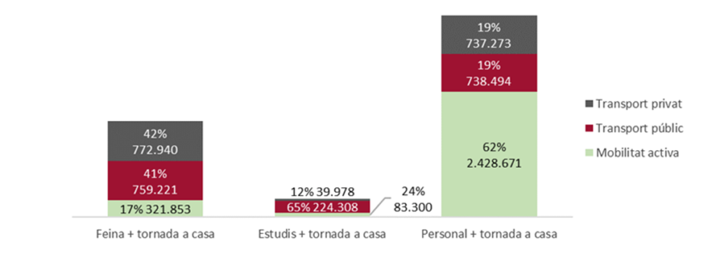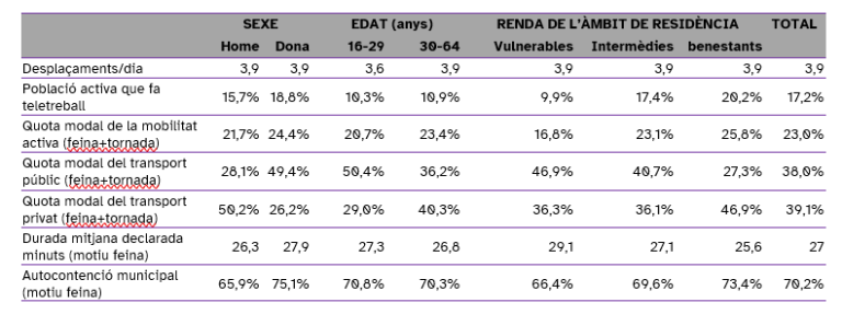 En Barcelona se hacen cada día 1,85 millones de desplazamientos por motivos laborales, un 30,4% de la movilidad cotidiana, según un estudio del Instituto Metrópoli para CCOO. Del total de trayectos que se hacen diariamente para ir a trabajar, un 42% se hacen con vehículo privado, seguido de cerca por el transporte público, un 41%. Aspectos como la edad, el nivel socioeconómico, el origen, el género y las capacidades físicas o intelectuales determinan las formas de movilidad y, por lo tanto, acentúan las desigualdades sociales entre la población. Por ejemplo, el acceso al vehículo privado es menor entre la población de menos renta, las mujeres, la población joven o las personas con discapacidad. Así pues, la falta de un servicio público alternativo limita el acceso a trabajos y perpetúa situaciones de exclusión.