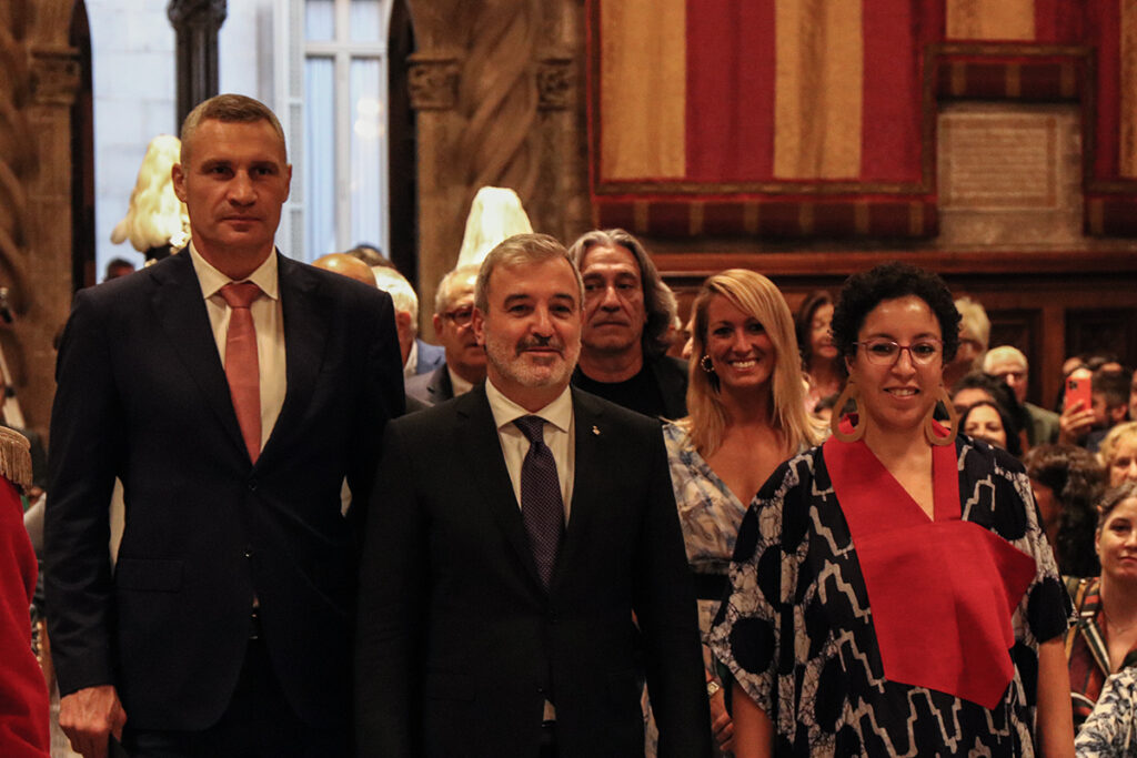Lo habían precedido en el uso de la palabra dos hombres: los alcaldes de Barcelona, Jaume Collboni, y de Kiiv, ciudad invitada en las fiestas de la Mercè, Vitali Klichkó. Collboni, en su primera Mercè como alcalde, ha mostrado su solidaridad con las personas afectadas por la guerra de Ucrania, el terremoto de Marruecos, las inundaciones en Libia o la crisis migratoria en Lampedusa. También ha recordado a la cooperante Emma Igual, asesinada en Ucrania, el quincuagésimo aniversario del golpe de Estado en Chile y a dos personas que nos han dejado este año: el dibujante Francisco Ibáñez y el empresario y mecenas Antoni Vila Casas. Y ha tenido un último recuerdo amable antes de dar paso al toque de inicio de las fiestas: La acción de dos agentes de la Guardia Urbana que hace unos días ayudaron al parto de una mujer, en un portal de las calles de Barcelona. La nueva barcelonesa se llama Gaia.