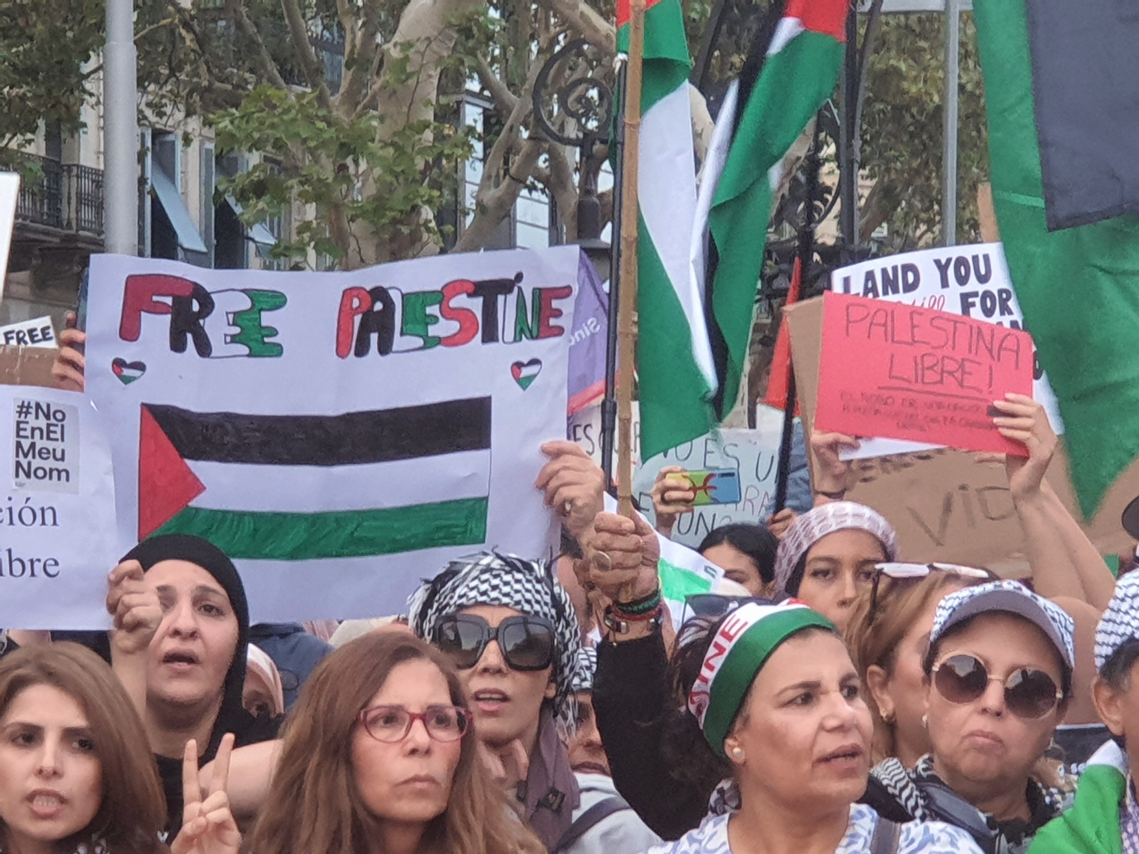 La manifestación comienza a bajar y la calle cada vez está más llena de gente. Los voluntarios de las diferentes entidades forman una barrera protectora con sus brazos para que todo el mundo pueda estar seguro. A cada lado de la calle hay gente con pancartas y cartulinas, mostrando imágenes de la brutalidad que se vive en Palestina, haciendo sátira de los dirigentes israelís y con lemas de esperanza y voluntad de cambio.