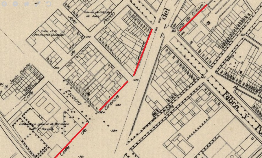 Otras personas de esa primera hornada fueron su vecino Francisco Callico, Andrés Carrió, Leonor Gaspà o Félix Font, este último domiciliado en el 33 de la calle, con la particularidad de hallarse entre Fabra i Puig y el tope genuino de Orense, sito en una confluencia del torrent de Piqué, tal como puede apreciarse en el mapa parcelario de 1931.