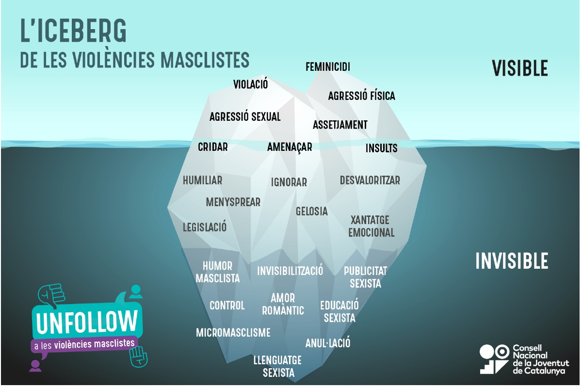 Vall en su libro explica de forma muy acertada y clara lo que llamamos “el iceberg de las violencias machistas”, que muestra que esa capa invisible de violencias machistas son las más comunes, y que sirven de trampolín a las violencias más extremas.