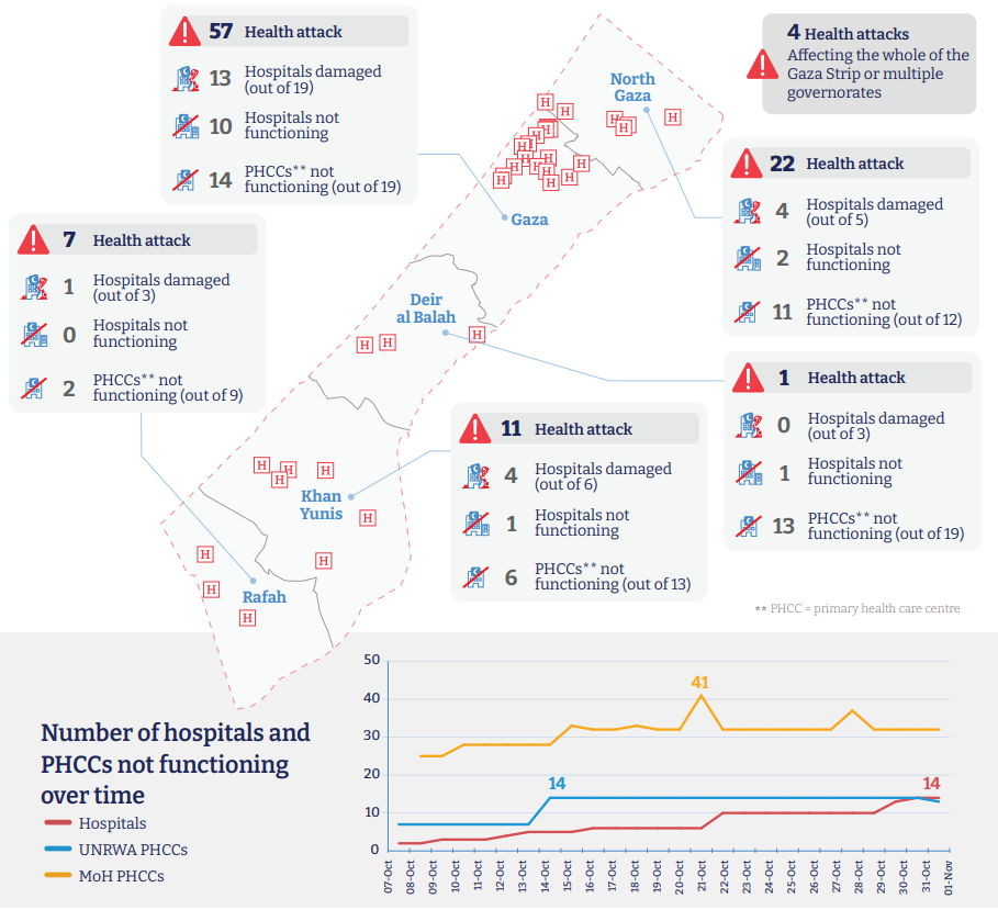 Según la Organización Mundial de la Salud (OMS) en los Territorios Palestinos Ocupados, desde el 7 de octubre hasta el 4 de noviembre, las fuerzas armadas israelíes han perpetrado hasta 102 ataques contra la atención sanitaria en la Franja de Gaza, causando la muerte de 504 personas, incluyendo a 16 profesionales sanitarios en servicio. En el conjunto de los Territorios Palestinos Ocupados, el número de ataques asciende a casi 200, teniendo en cuenta los 96 ataques en Cisjordania registrados del 7 al 24 de octubre.
