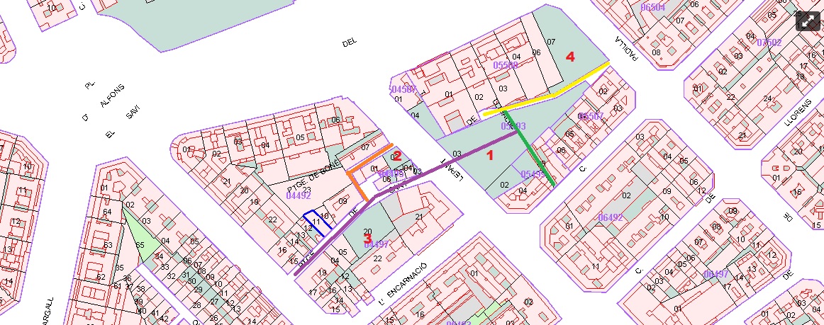 El Lligalbé sería el primer eje de ese pacto entre preservación patrimonial y sostenibilidad. La conservación de los muros para encauzar el torrente parte este trecho del parque en dos para sintetizar su historia. Embellecerlo conllevaría enlazarlo con los pasajes, pues como hemos comentado, el de Sant Pere, rojo en la imagen, llega hasta su senda.
