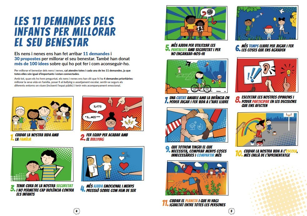 Once demandas, treinta propuestas y más de cien ideas han aportado los niños y niñas de la ciudad de Barcelona para mejorar el bienestar de la infancia. Se trata de la segunda edición de la Agenda de los Niños elaborada por el Instituto Infancia y Adolescencia en la que han participado más de 5.000 alumnos de entre 8 y 11 años.