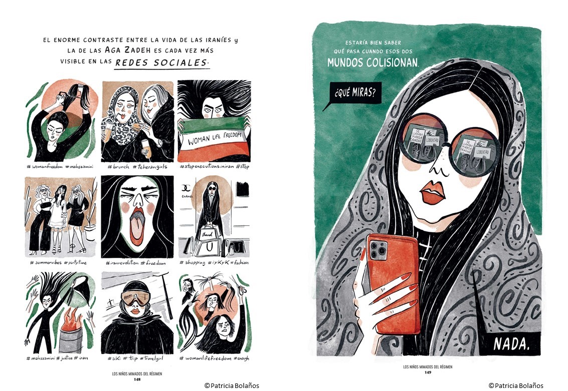 En la historia con Paco Roca nos narra la importancia de las manifestaciones surgidas en el ámbito universitario y de cómo los hombres apoyaron a sus compañeras, mientras que en el caso de Patricia Bolaños, la historia se centra en la hipocresía del régimen iraní y en la doble moral de sus dirigentes, al retratar a una generación de jóvenes conocidos como los «aga zadeh», que son los hijos de los oligarcas iranís, muchos de ellos enriquecidos gracias a lo que han robado al pueblo. Estos jóvenes viven su vida de forma parecida a la de los occidentales y, de la misma manera, la exponen en las redes sociales, dejando en evidencia las leyes islámicas que sus padres imponen a la sociedad como policías de la moral. Por ejemplo, las chicas suben fotografías en bikini y sin velo a Instagram desconectadas de la realidad de su entorno.