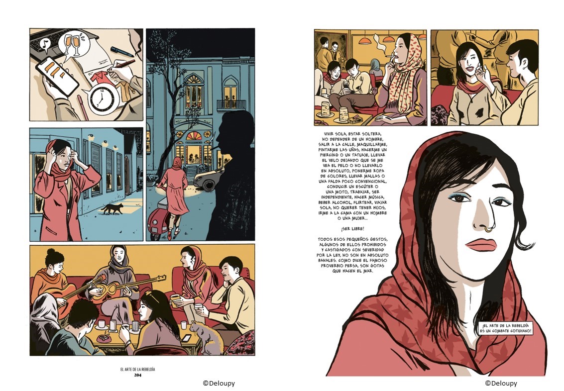Algunas de las historias son estremecedoras, todas basadas en hechos reales, como la de la dibujante Coco que ilustra la historia de la joven arrestada por ir a un campo de fútbol, y que decidió inmolarse para no volver a la cárcel. Algunos expertos hablan de que se trata de la primera revolución de marcado acento femenino, con mujeres protagonistas en el movimiento, como Narges Mohammadi, recientemente galardonada con el premio Nobel de la Paz 2023, que no pudo asistir a la ceremonia por estar recluida en una cárcel de Irán donde es torturada por el régimen, tal y como narra en su libro Tortura blanca (2023), donde recoge el testimonio de las vejaciones sufridas de 14 mujeres, incluida ella misma, encarceladas por defender sus derechos. Ninguna de ellas ha cometido delito, son presas políticas o rehenes como moneda de cambio.