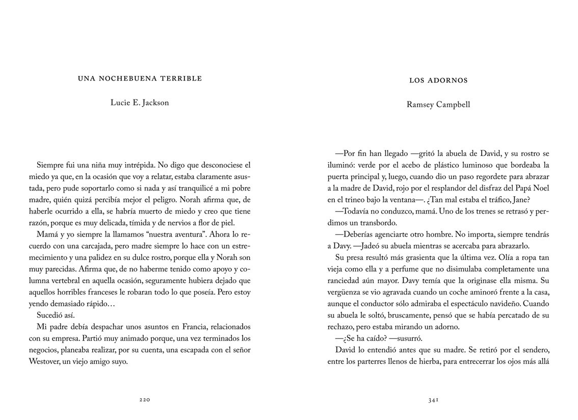 En la lista de relatos seleccionados de finales del siglo XIX y principios del XX, destacan autores tan emblemáticos como Frank Cowper, Marjorie Bowen, John Kendrick Bangs, Emilia Pardo Bazán o Howard Phillips Lovecraft. También incluye un relato de 2006, que permanecía inédito en castellano, del considerado uno de los mejores herederos del legado de Lovecraft, el autor británico Ramsey Campbell, el único autor vivo de la antología, que firma un relato terrorífico asociado a los ruidos, sombras y aspectos siniestros de los adornos navideños. Toda una revelación del terror cotidiano y próximo, en el hogar, exponente también del terror urbanita, de un autor considerado como el maestro del horror contemporáneo.