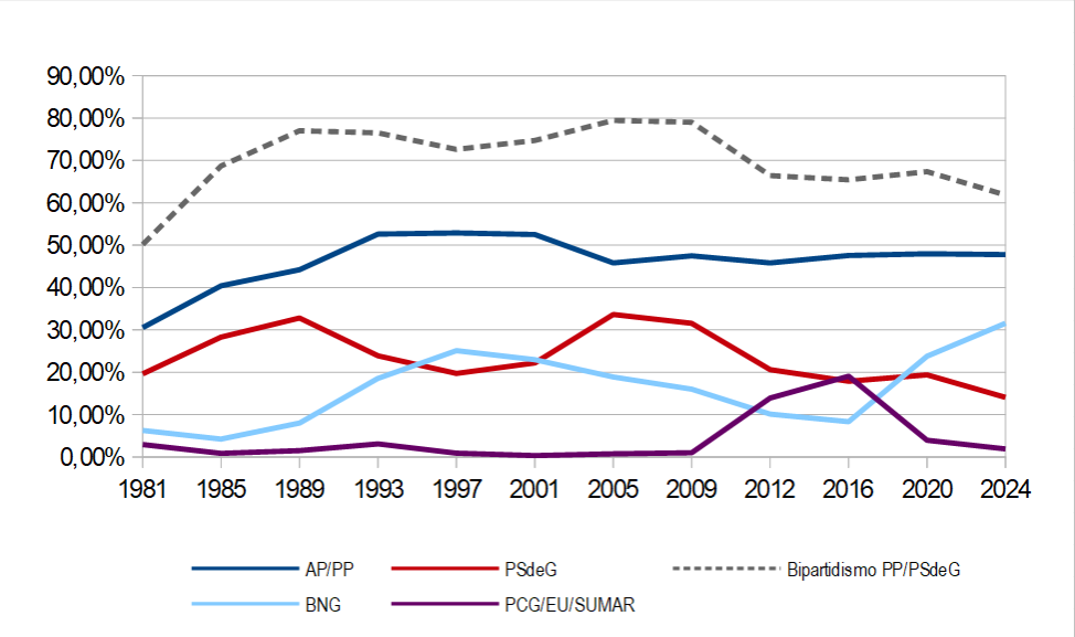 Sin embargo, la competencia electoral será un estímulo para el BNG que, frente a la aparición de estos competidores, se replantea su propio liderazgo y modelo organizativo. No es difícil hoy ver claramente la continuidad que se establece entre 2012 y 2024 en los resultados de En Marea y BNG, donde este sustituye al primero sin que por ello decaiga el bipartidismo con un PSdeG en mínimos históricos y vuelvan al extraparlamentarismo los herederos del PCG.