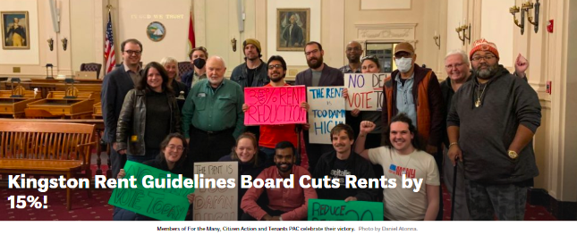 Tras lograr que el gobierno de la ciudad declarara la emergencia de la vivienda e implementara el programa EPTA (Emergency Tenant Protection Act), se creó el Rent Guidelines Board, una junta formada por residentes de Kingston, representantes de la parte arrendataria y la parte arrendadora y profesionales con experiencia en vivienda y economía, que tiene entre sus funciones establecer las pautas anuales para el incremento de las rentas en los pisos con alquiler estabilizado, realizar audiencias públicas para resolver disputas entre las dos partes de un contrato de alquiler e investigar las condiciones del mercado en la ciudad.