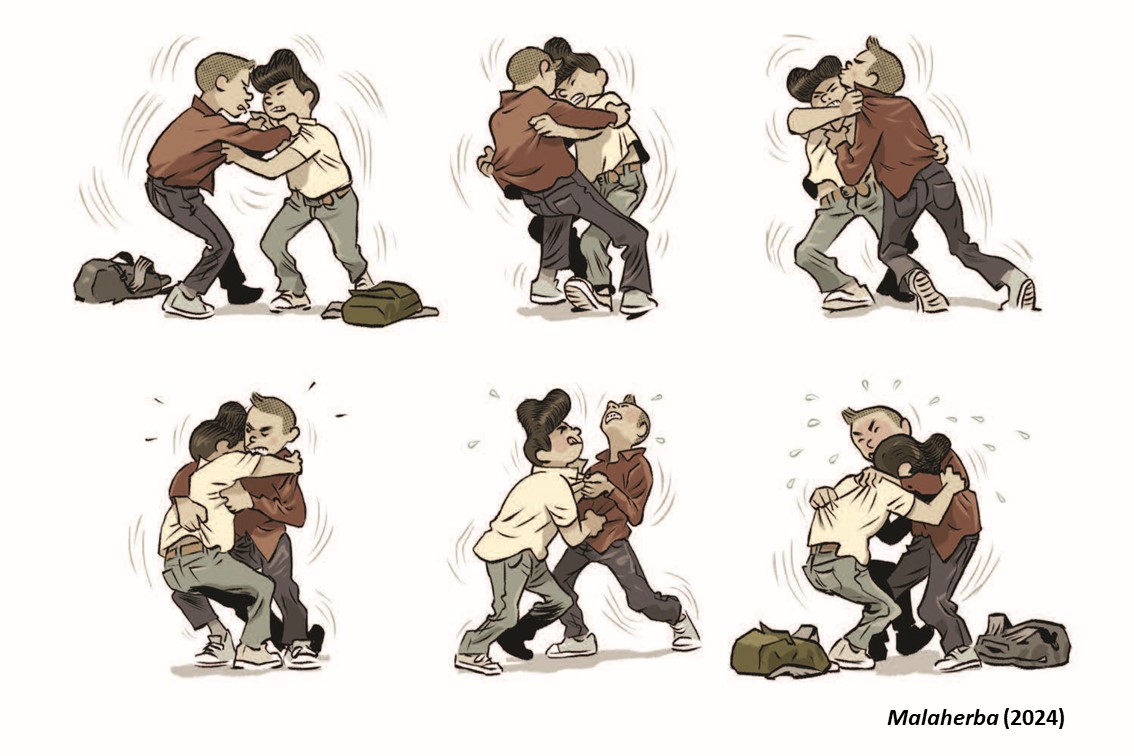 La primera novela gráfica a destacar es de producción autóctona: Malaherba (2024), con dibujo y guion adaptado de Bartolomé Seguí, publicado por el sello Salamandra Gaphic, que adapta la novela homónima de 2019 escrita por Manuel Jabois. La habilidad de Seguí nos transporta visualmente a los años noventa en Campolongo, una pequeña localidad de la provincia de Pontevedra (Galicia), siguiendo los pasos del joven protagonista a lo largo de los años. Como en la novela en la que se basa, lo conocemos a partir de los actos cotidianos del día a día: la asistencia a la escuela, las interacciones con los amigos o los conflictos familiares irán formando la personalidad del joven, mientras el autor (o autores, en este caso), nos invita a reflexionar sobre si nuestro destino está condicionado por nuestros padres. O más en concreto, por lo que fueron nuestros padres en su juventud, porque lo que hagan o les suceda en ese momento, seguro que tiene repercusión, tal y como queda reflejado desde la primera página.