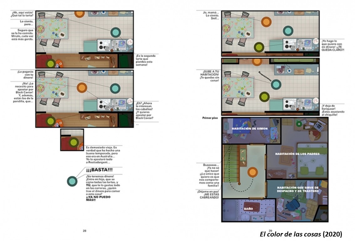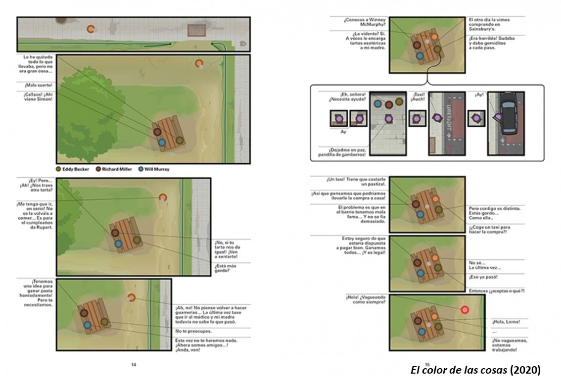 La crueltat dels nens que s’entreveia a Malaherba, a Un pulpo en la garganta s’expressa en tota la seva esplendor, amb accions despietades i inhumanes que, suposant que els personatges s’inspirin en la realitat, tindran conseqüències terribles a la seva edat adulta. L’assetjament i la humiliació no són gratuïts, però formen part de la quotidianitat del pati de l’escola o del carrer. Aquest mateix carrer amarg on al protagonista de la següent novel·la gràfica els suposats amics humilien, colpegen i roben, abusant de la seva ingenuïtat. Ens referim a la singular El color de las cosas (Die Farbe der Dinge, 2020), amb dibuix i guió de Martin Panchaud, traduït al castellà per Xisca Mas, publicat pel segell Reservoir Books del Grupo Editorial Penguin Random House.