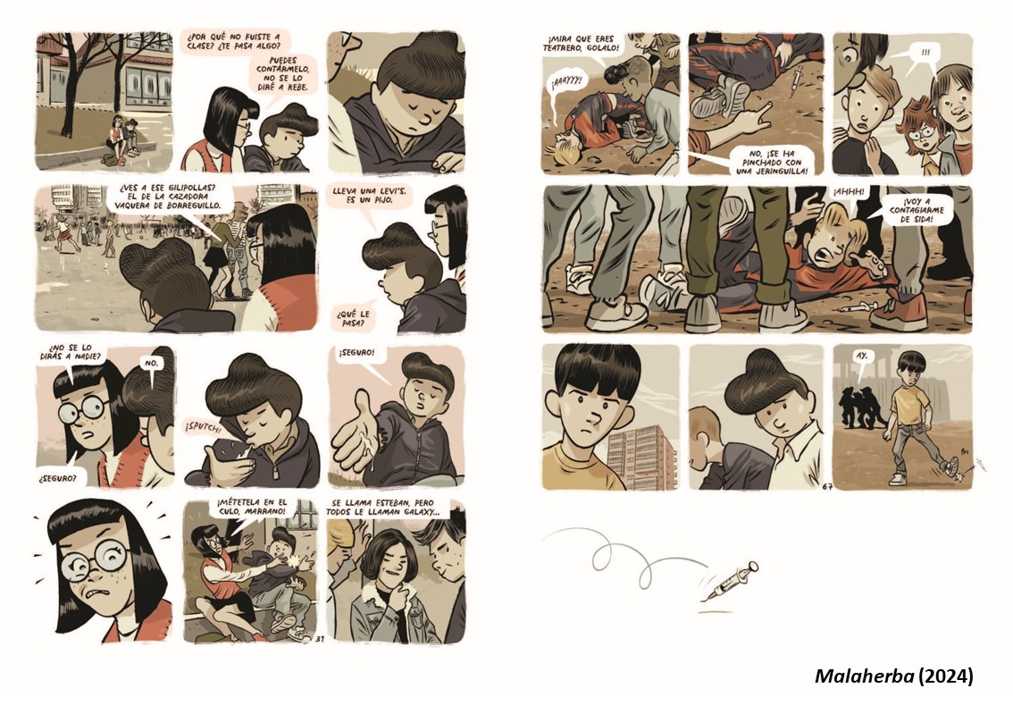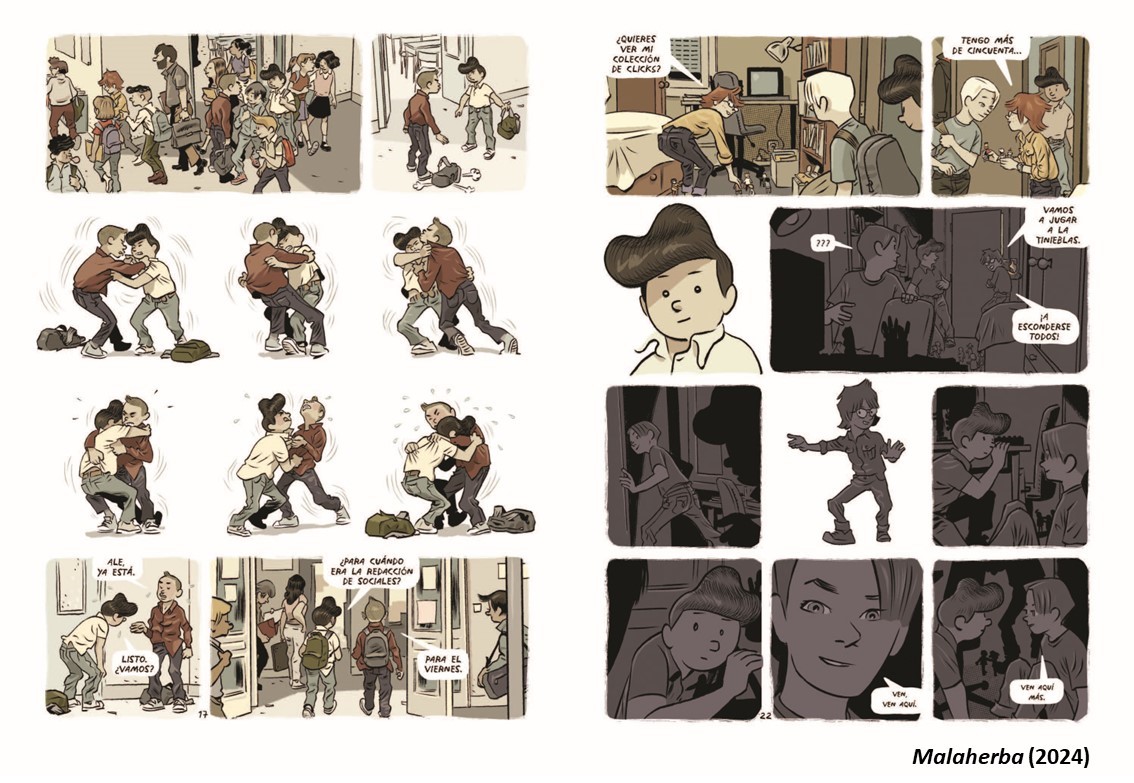 La primera novel·la gràfica a destacar és de producció autòctona: Malaherba (2024), amb dibuix i guió adaptat de Bartolomé Seguí, publicat pel segell Salamandra Gaphic, que adapta la novel·la homònima de 2019 escrita per Manuel Jabois. L’habilitat de Seguí ens transporta visualment als anys noranta a Campolongo, una petita localitat de la província de Pontevedra (Galícia), seguint els passos del jove protagonista al llarg dels anys. Com a la novel·la en la que es basa, el coneixem a partir dels actes quotidians del dia a dia: l’assistència a l’escola, les interaccions amb els amics o els conflictes familiars aniran formant la personalitat del jove, mentre l’autor (o autors, en aquest cas) ens convida a reflexionar sobre si el nostre destí està condicionat pels nostres pares. O més concretament, pel que van ser els nostres pares en la seva joventut, perquè el que facin o els passi en aquell moment, segur que té repercussió, tal com queda reflectit des de la primera pàgina.